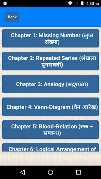 يتكون التطبيق من 21 فصلاً يغطي مواضيع مختلفة مثل العدد المفقود والتشابه والعلاقة الدموية وترميز فك التشفير وترتيب الترتيب والعديد من المواضيع الأخرى. تم تصميم التطبيق بلغة هندية سهلة ويتميز بخط واضح لتحسين القراءة. كما يحتوي على واجهة سهلة الاستخدام وخيار التكبير لتجربة أفضل. الجزء الأفضل هو أنه يعمل دون اتصال بالإنترنت ، لذلك لا يلزم اتصال بالإنترنت.